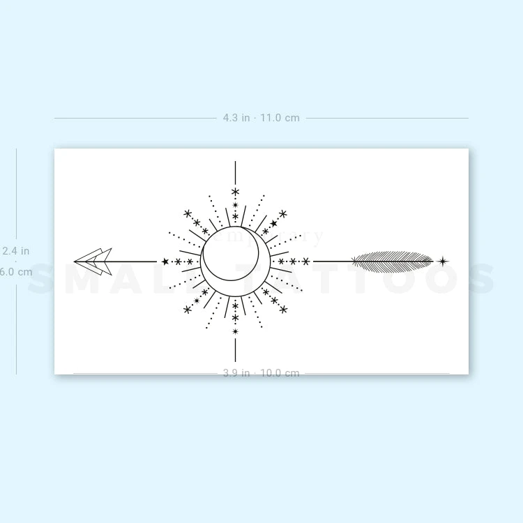 Our arrow compass temporary tattoo contains intricate detailing and symbolism that will appeal to those in the know. When you look closer, you’ll also discover a crescent moon, stars, and the sun. If you love this design as much as we do, our adhesive tattoos provide you with the best way to try before you buy. This eco-friendly sticker tattoo comes in a set of three so you can try out placements or share with a friend!
