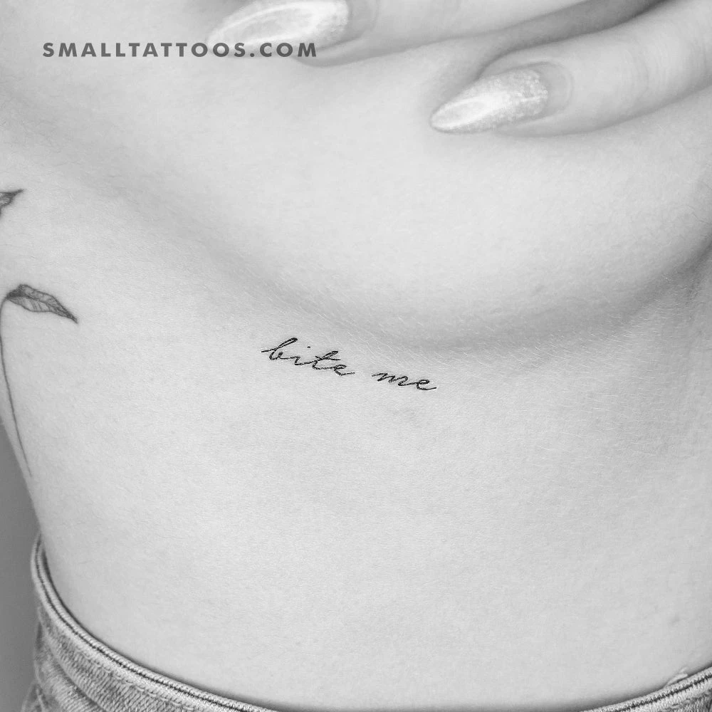Handwritten font style ‘bite me’ in black temporary tattoo.