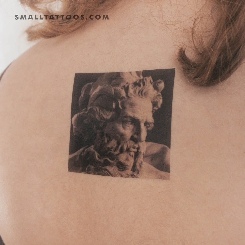 Black and grey style Lambert-Sigisbert’s ‘Bust of Neptune’ inspired temporary tattoo.