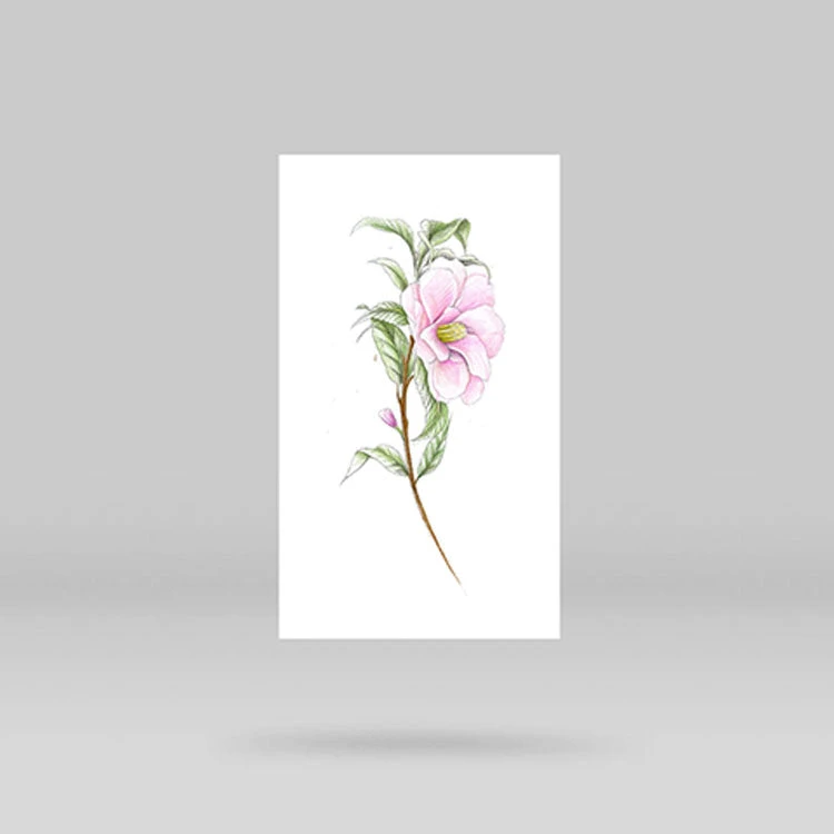Illustrative style pink camellia temporary tattoo, designed by professional tattoo artist Mini Lau.