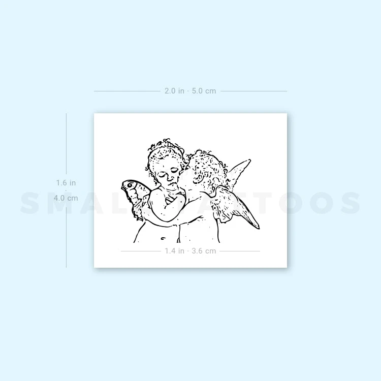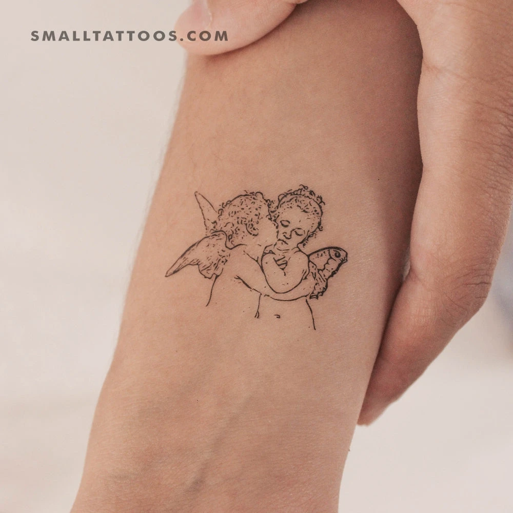 Fine line style version of William Adolphe Bouguereau’s The First Kiss temporary tattoo.