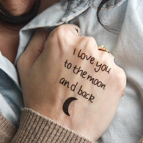 The ‘i love you to the moon and back’ adhesive tattoo is accompanied by a crescent moon as well, which gives an extra storybook touch to it, and the handwriting font acts as the perfect cherry on top to make it look extra personal.