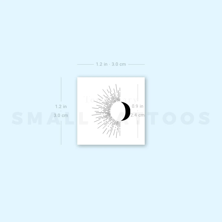 Our minimalist sun and moon fake tattoo features a crescent moon and half of the sun, with a series of sparkling lines protruding from it. The combination of these shapes will have a shining sun-like presence on your skin.Â