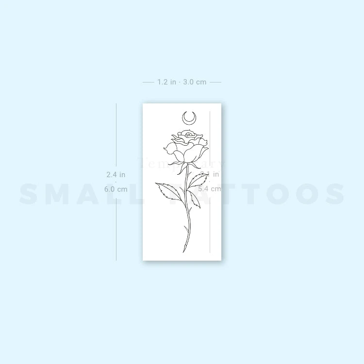 Moon rose temporary tattoo, composed of a beautiful fine line style rose and a crescent moon.