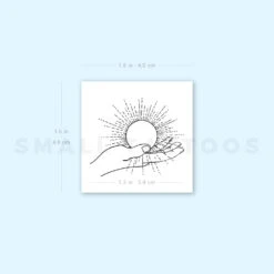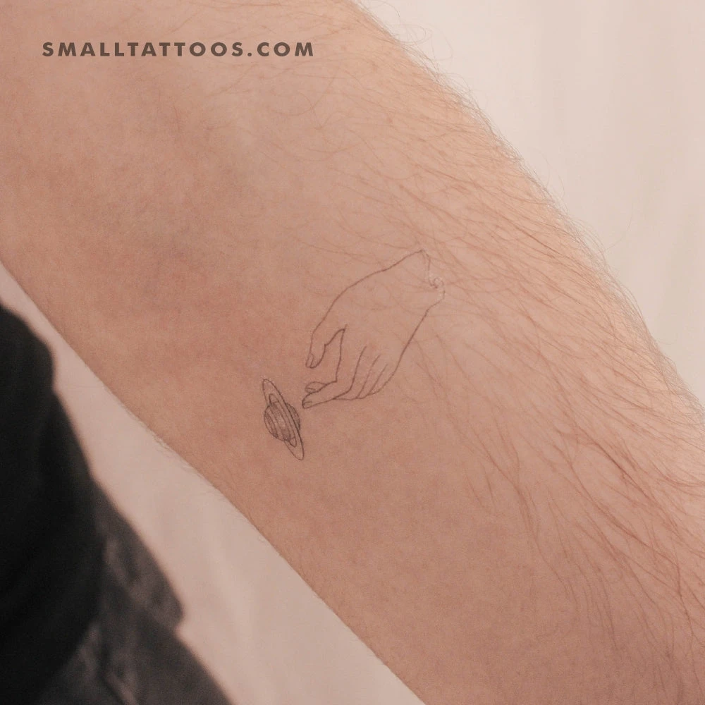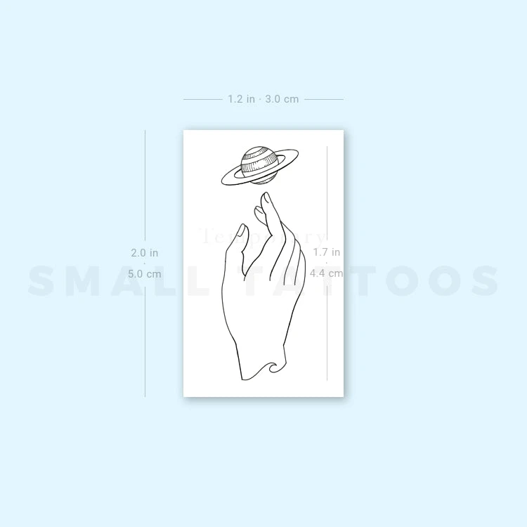Saturn temporary tattoo, composed of a beautiful fine line style hand and planet Saturn.