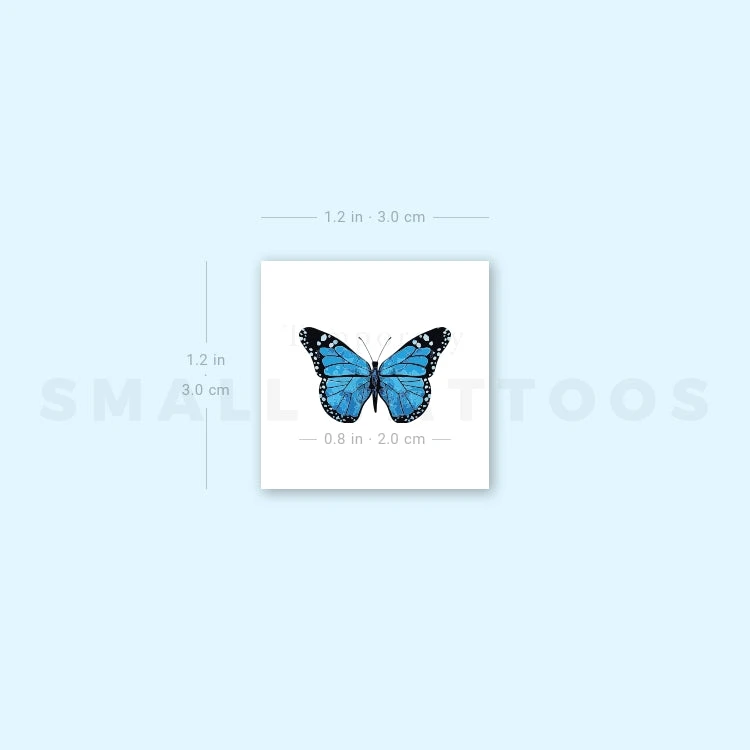 Our small blue butterfly temporary tattoo was designed in the illustrative style, incorporating fine detailing and color gradients to produce an elegant result. A portrayal of a swallowtail butterfly, this is an ideal fake tattoo for anyone who holds these beautiful creatures in high esteem. You might choose this design because you love the color blue or because you are attracted to the symbolism of a blue butterfly.