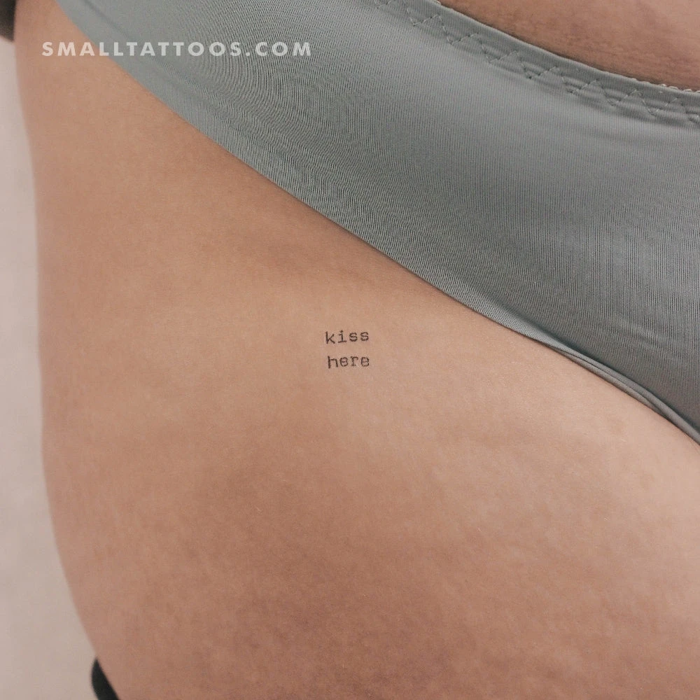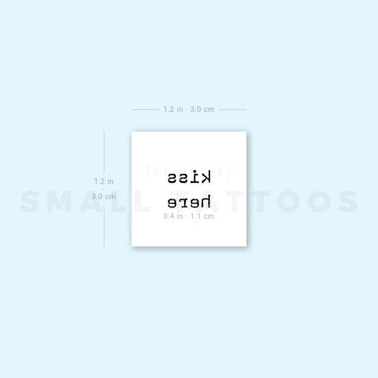 Small typewriter font ‘kiss here’ temporary tattoo.