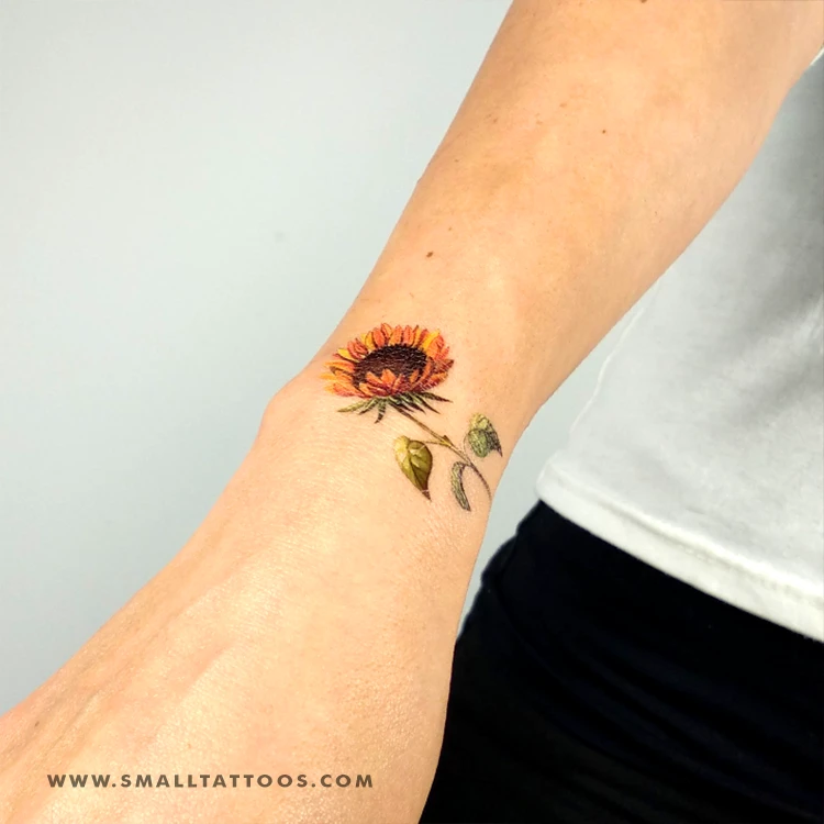 Watercolor style sunflower temporary tattoo, designed by tattoo artist Lena Fedchenko.